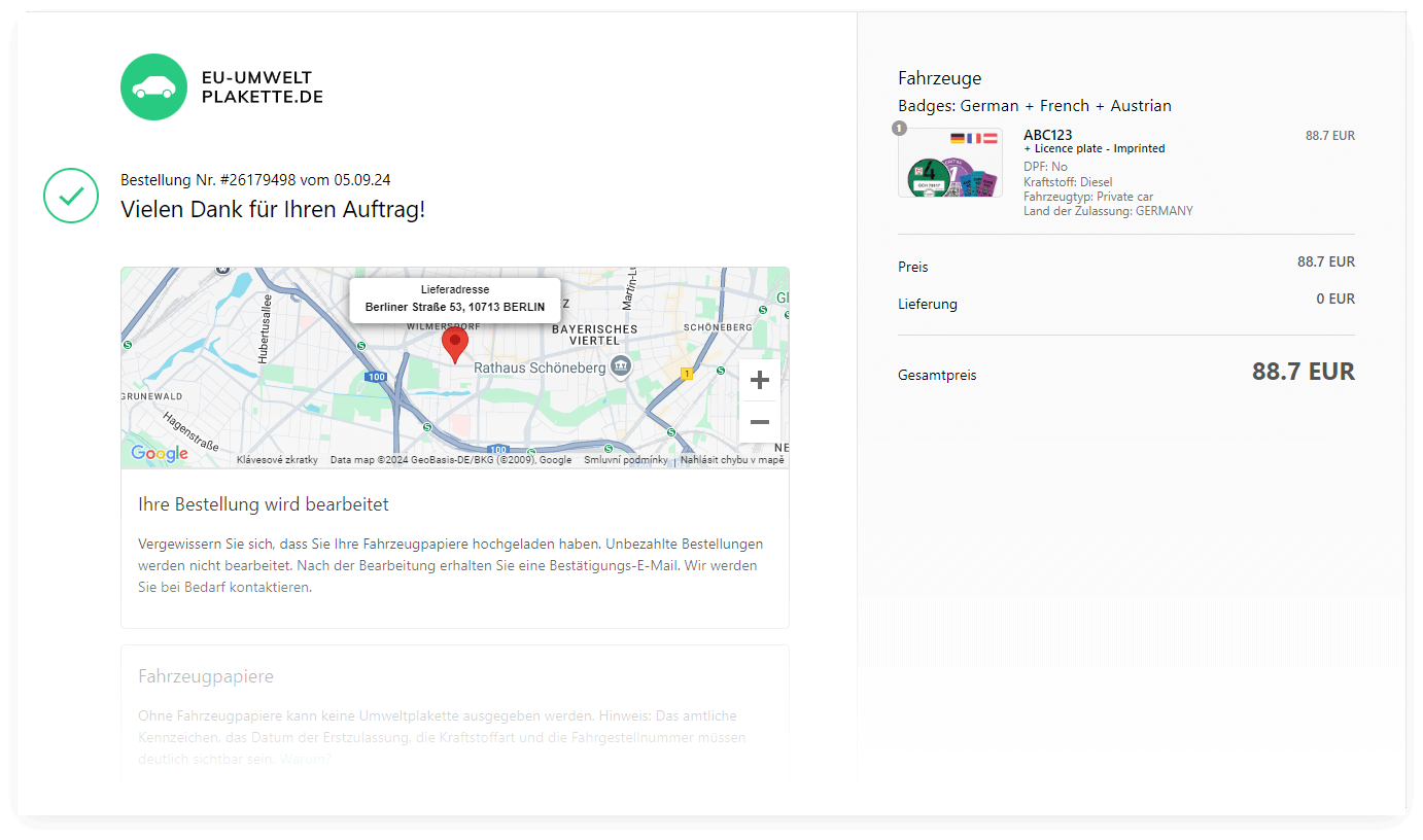 Sobald Ihre Bestellung versandt wurde, erhalten Sie von uns eine E-Mail und eine eingescannte Kopie Ihrer Umweltplakette