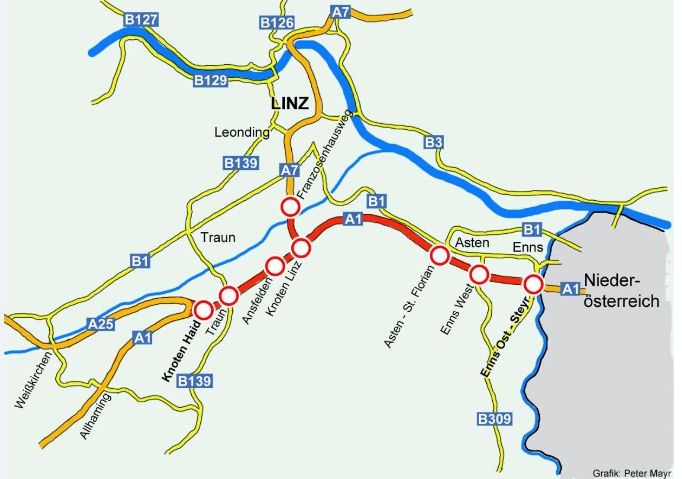 Die Beschränkungen gelten für einen rund 20 km langen Autobahnabschnitt bei der Stadt Linz und werden voraussichtlich auf weitere Abschnitte ausgedehnt. Falls Sie einen Lkw über 3,5 Tonnen haben, muss dieser mit der österreichischen Umweltplakette gekennzeichnet sein.